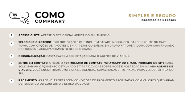 Selecione o Roteiro: Explore opções que incluem safáris no Kruger, Garden Route ou Cape Town, com opções de pacotes de 4 a 14 dias ou saídas em grupo FRT Operadora com guia falando português e acompanhamento desde o Brasil