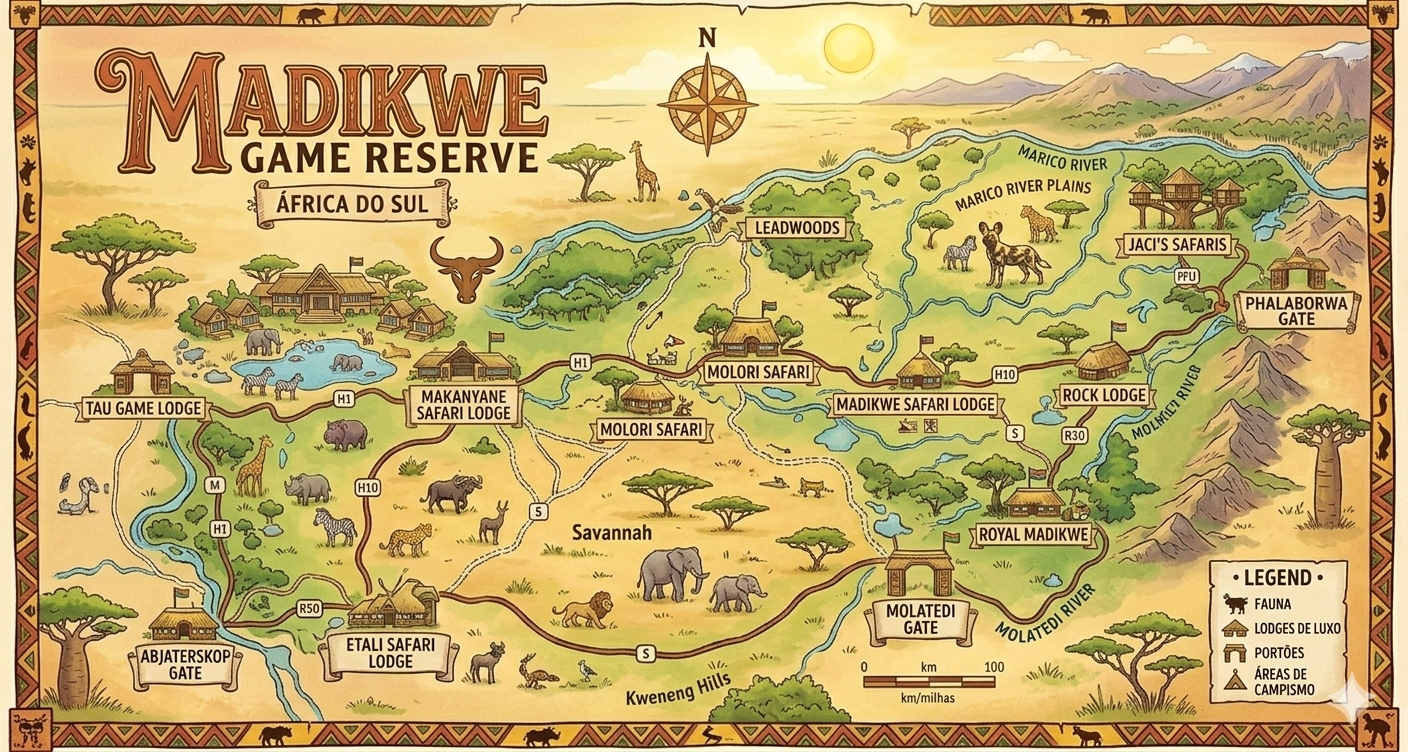 Madikwe Game Reserve é uma das maiores reservas de vida selvagem da África do Sul, localizada na fronteira com a Botswana, na província de North West. Com uma área de aproximadamente 75.000 hectares, a reserva é um dos destinos mais impressionantes para safáris do país, oferecendo uma rica diversidade de flora e fauna, além de uma experiência única e imersiva na natureza. Aqui está um detalhamento sobre a gastronomia, cultura, atividades, experiências, infraestrutura e acomodações disponíveis em Madikwe.