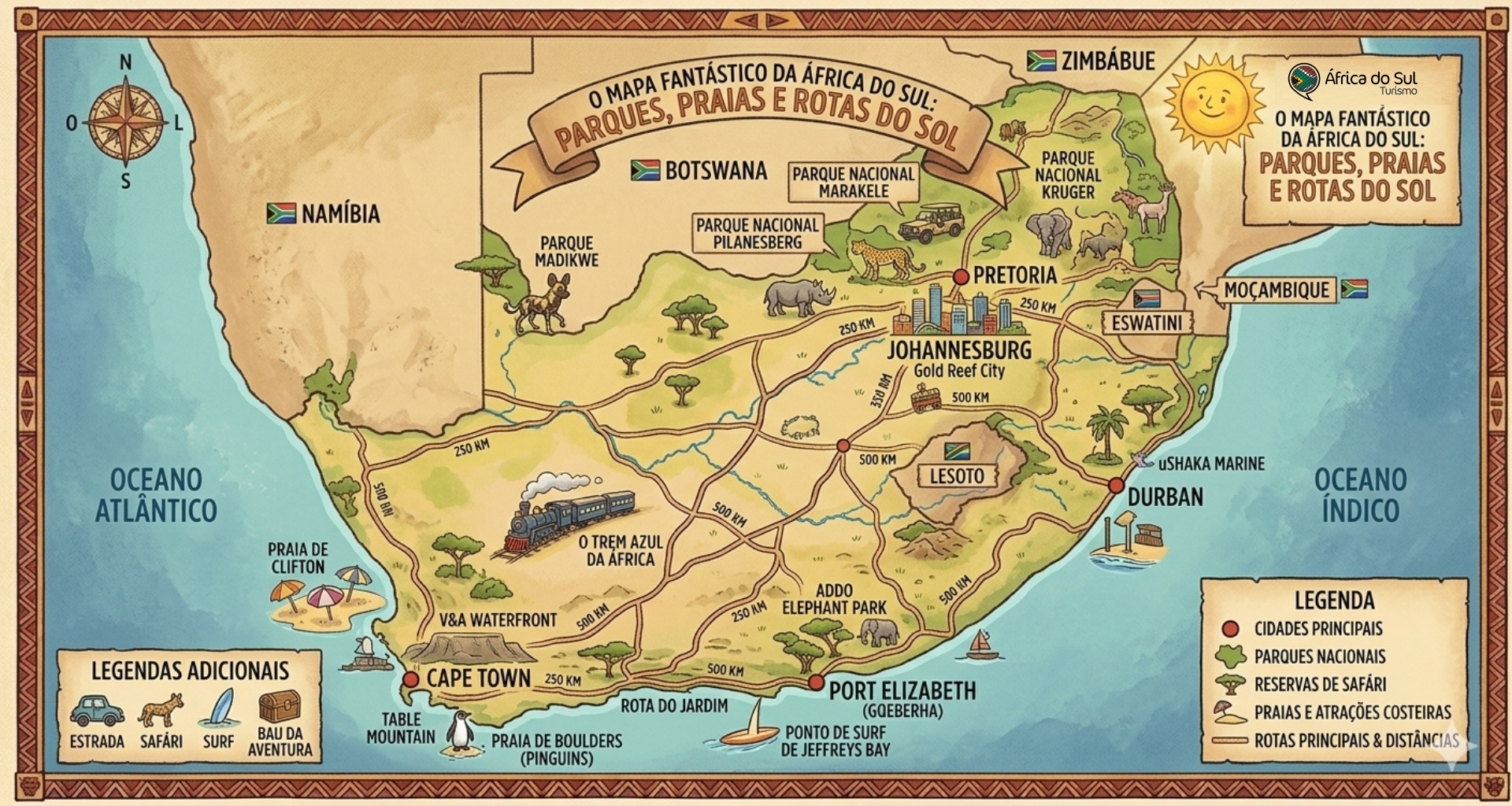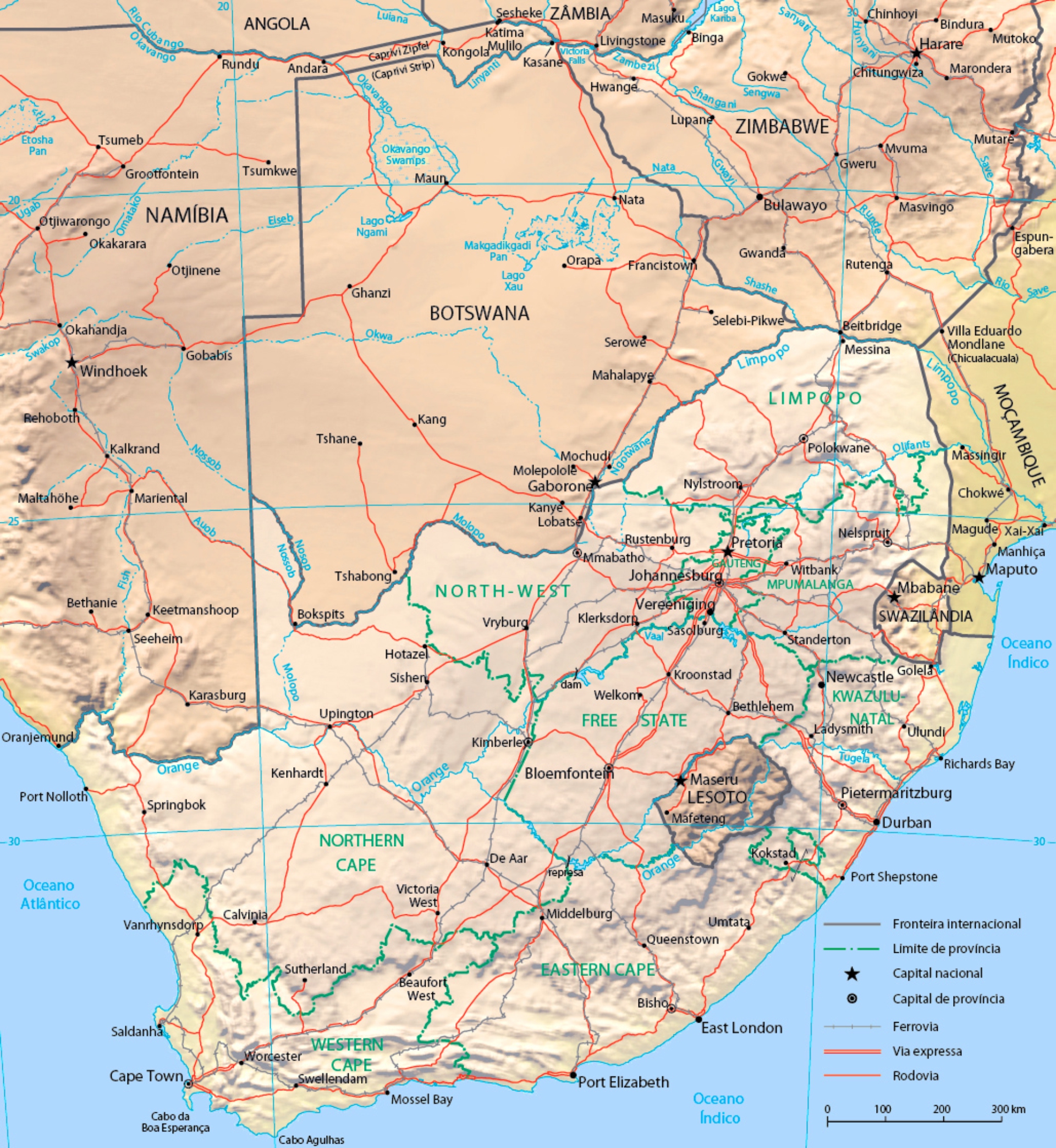 Mapa físico, político, turístico e ilustrações da África do Sul .