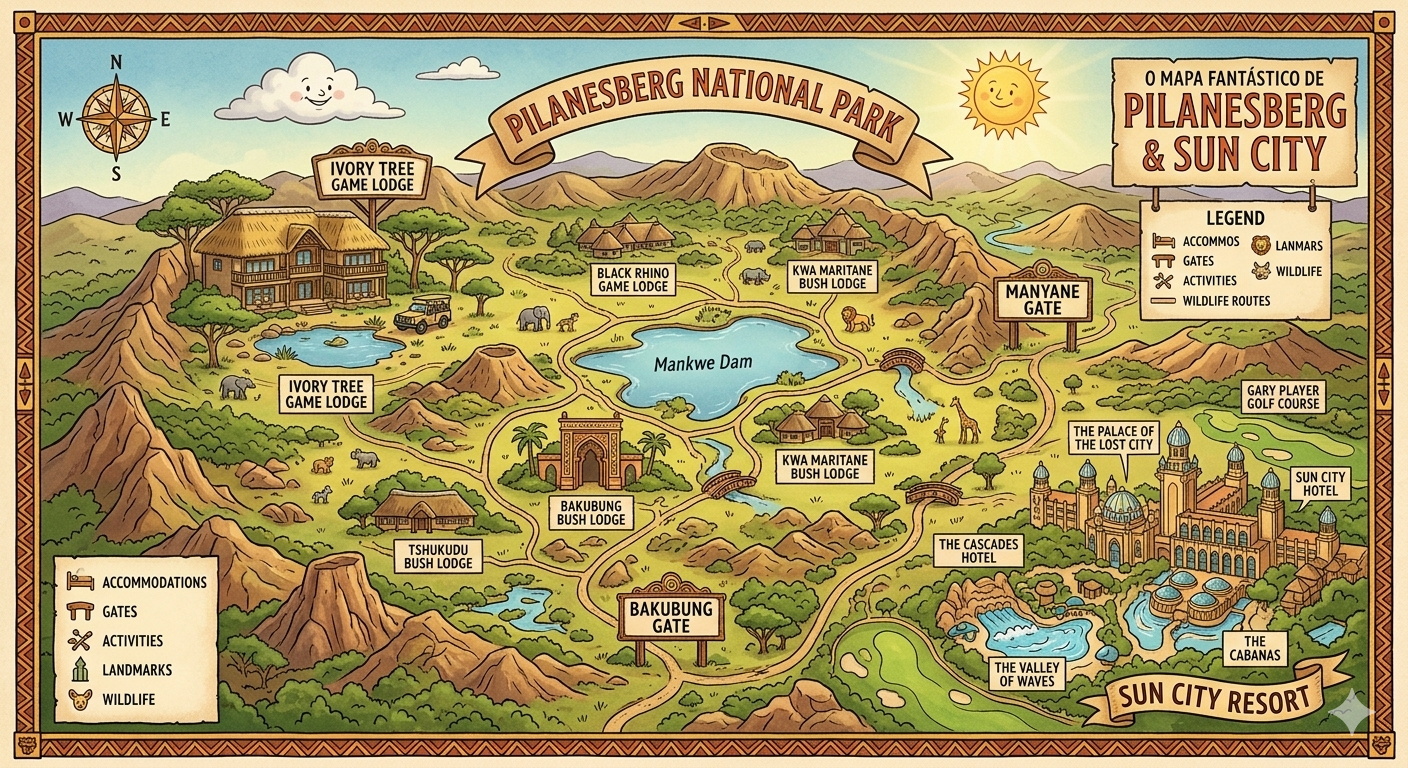 O Pilanesberg National Park é uma das principais atrações de vida selvagem da África do Sul, localizado na província de North West, a cerca de 2 horas de carro de Joanesburgo e Pretoria. Este parque é famoso por sua biodiversidade, paisagens deslumbrantes e pela proximidade com a área metropolitana, tornando-se um destino popular para safaris de um dia e escapadas de fim de semana. Aqui estão alguns detalhes sobre o Pilanesberg National Park: