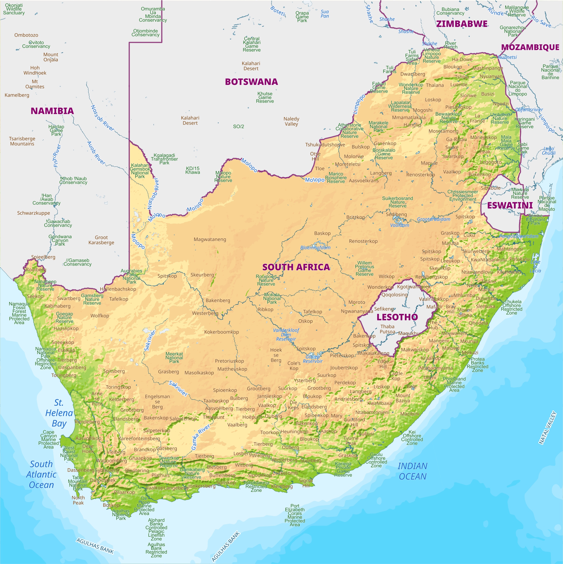 Mapa físico, político, turístico e ilustrações da África do Sul .